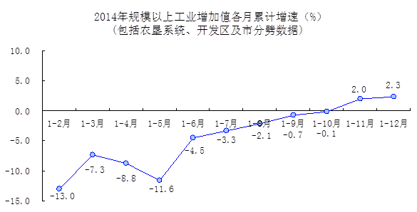 从各月增速看,我区规模以上工业增加值连续10个月负增长,其中,2月份累计增速最低,为下降13.0%,6月份回升趋势明显,为下降4.5%,随之逐月成小幅波动回升趋势,11月份扭转了不利局面,实现了正增长,12月份达到最高值,累计增速为2.3%。