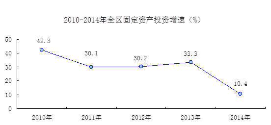 与2013年相比,2014年全区主要经济指标增速也出现不同程度的回落或放缓。地方公共财政预算收入、规模以上工业增加值、固定资产投资、社会消费品零售总额等指标增速较上年分别回落0.5、10.1、22.9和1.2个百分点。
