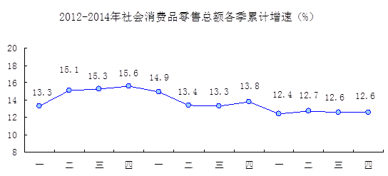 3、消费缺乏新热点。今年以来,由于市场和政策的因素,家用电器、通讯器材、金银珠宝等消费热点逐渐回归常态,传统商业受到冲击,而新的消费热点没有培育形成,传统行业快速增长难度加大,居民消费倾向持续减弱。2014年社会消费品零售总额增速同比回落1.2个百分点;限额以上批发和零售业中,家具类、金银珠宝类和通讯器材类商品零售额增速较上年分别回落48.2、29.4和25.2个百分点。